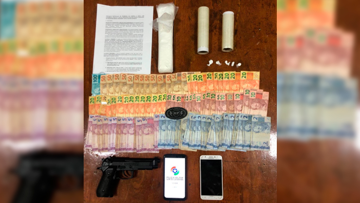 O suspeito foi abordado em frente a sua própria residência e durante uma revista pessoal uma bucha de cocaína teria sido encontrada. O relatório da PM informa ainda que após buscas no interior da residência outras buchas de cocaina foram encontradas bem como um simulacro de arma de fogo, material para embalar as drogase uma quantia de R$ 1.539 em espécie foi também foi localizado.