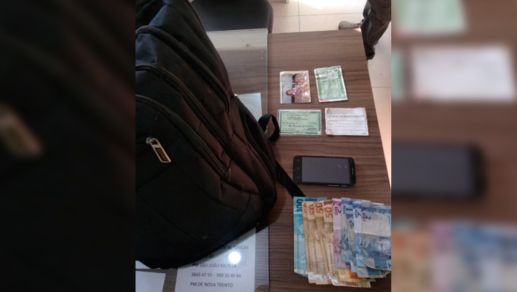 A Polícia foi acionada e em posse das características do masculino realizou a abordagem. Feita revista pessoal a guarnição informou que foi encontrado o celular, documento da vítima e a quantia de R$ 335.