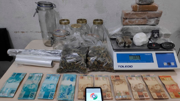 Policiais informaram que feita revista pessoal foi encontrado dois comprimidos de ecstasy e 0,84 gramas de maconha. Já na casa do suspeito, 3,5 kg de maconha, 170 gramas Skank, 150 gramas de cocaína, material para embalar as drogas e R$ 9.056 em espécie teria sido localizado.