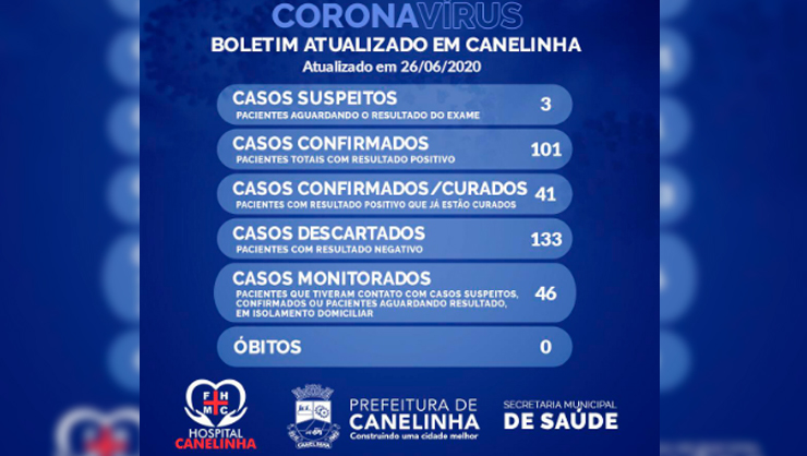 Dos 101 casos confirmados, 41 casos apresentam cura clínica, ou seja, pacientes não apresentam mais sintomas. O município conta ainda com 03 casos suspeitos, 133 casos descartados, 46 monitorados. Não houve registro de óbitos no município.