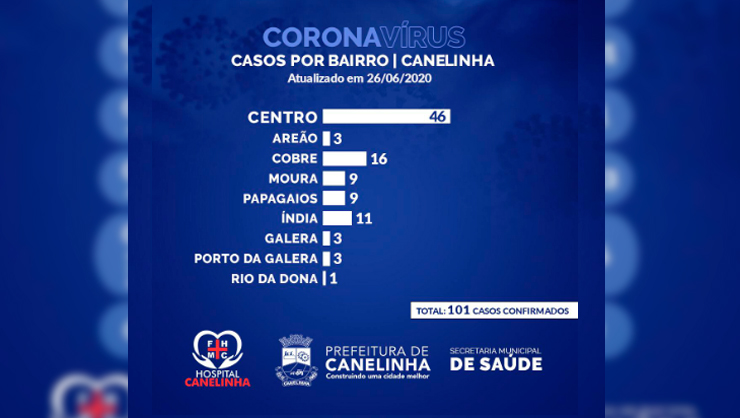 A Secretaria Municipal de Saúde de Canelinha informou no boletim diário desta sexta-feira (26), sete novos casos confirmados de coronavírus, com isso o município chega aos seus 101 casos confirmados da doença.