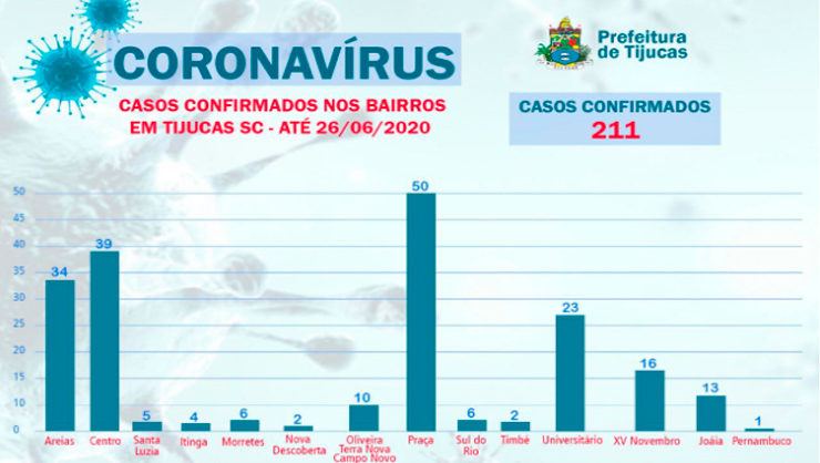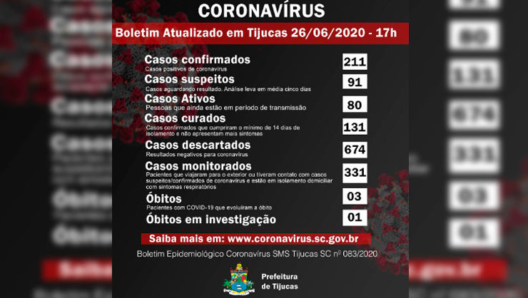 De acordo com informações divulgadas pela Diretoria de Comunicação da prefeitura junto com a Secretaria de Saúde o número de casos confirmados de coronavírus, em Tijucas, ultrapassa de 200. A informação foi repassada a comunidade através do boletim diário desta sexta-feira (26).