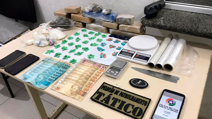 Em buscas na casa do suspeito, localizada na rua 902D, no bairro Alto São Bento, a polícia teria apreendido 331 comprimidos de ecstasy, 2,820 kg de maconha, 22 gramas de skank, 115 gramas de cocaína e uma quantia de R$ 1167 em espécie.