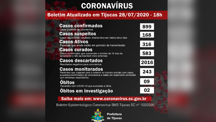 O relatório divulgado nesta terça-feira (28), mostra ainda que o município tem 316 casos ativos da doença, 168 casos suspeitos e 243 pessoas seguem em monitoramento.