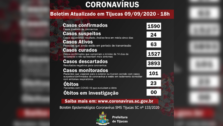 Os casos confirmados de coronavírus em Tijucas vem subindo rapidamente, todos os dias. Órgãos responsáveis pelo controle e combate a pandemia divulgaram um relatório com 1590 pessoas infectadas, dos quais 1527 já estão clinicamente curados.