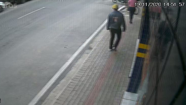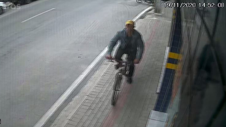 Com a ajuda de câmeras de segurança, foi possível observar o momento exato em que um homem leva a bicicleta do local. Ele aparenta ser moreno claro, altura mediana. Estava vestindo jaqueta jeans azul com um desenho de uma caveira nas costas, calça escura e boné amarelo.