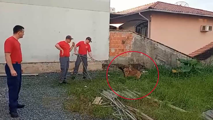 Bombeiros militares foram acionados para o recolhimento do cão. Após ser resgatado, o animal foi levado para o quartel do Corpo de Bombeiros de São João Batista e segue disponível par adoção.