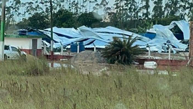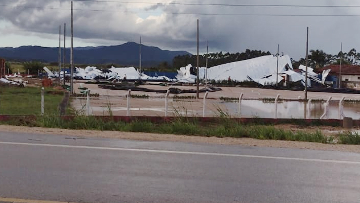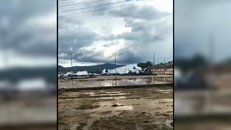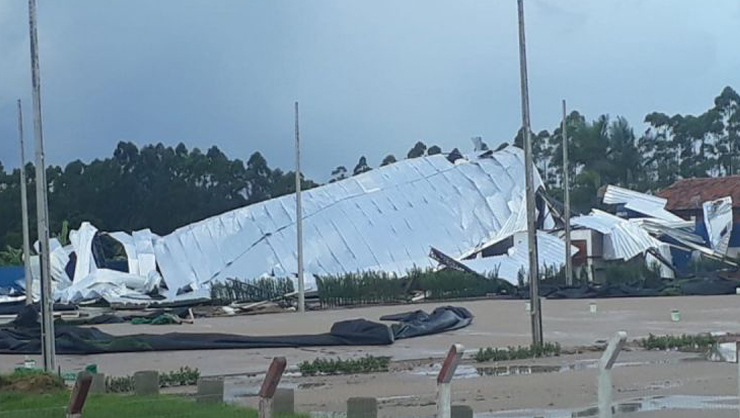 O telhado de uma quadra de futebol acabou desabando após um temporal que atingiu a região do Vale, durante a tarde desta quarta-feira (10). O vendaval ocorreu por volta das 16h40min, às margens da rodovia estadual SC-410, no bairro Nova Descoberta, em Tijucas.