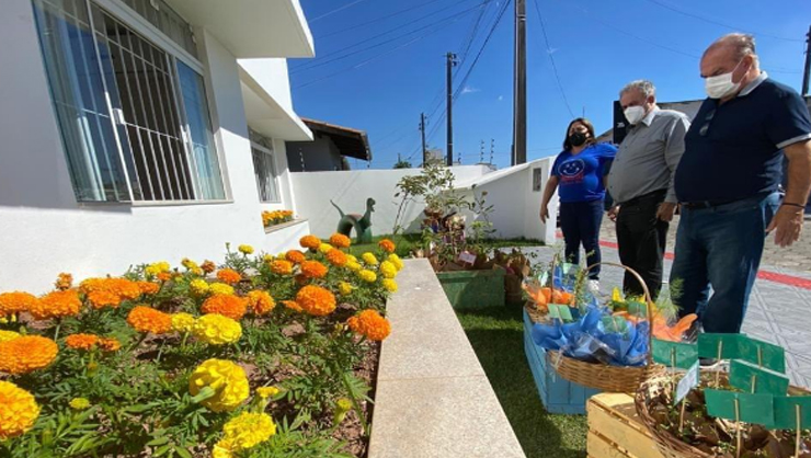O prefeito de Tijucas, professor Eloi Mariano Rocha e o vice-prefeito Sérgio Fernandes Cardoso estiveram na escola para conhecer o projeto e também plantaram sementes de girassol no jardim da escola.