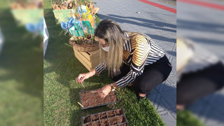 A secretária de Educação, Deise Juliana Silveira também esteve na escola e realizou o plantio das sementes de girassol.