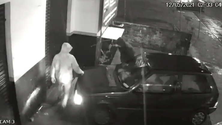 Câmeras de videomonitoramento registraram toda ação dos autores. Nas imagens, é possível ver que um dos indivíduos empurra o veículo furtado antes da fuga.