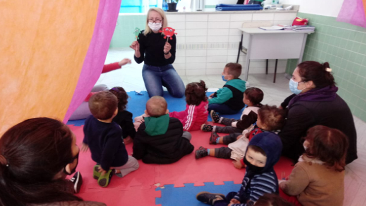 As professoras da Educação Infantil com apoio da gestão escolar promovem uma vez por semana uma parada para que as crianças possam ouvir histórias, contadas pela equipe. Na última semana, a história escolhida foi “Cuidado com o Menino”, de Tony Blundell, com tradução de Ana Maria Machado.