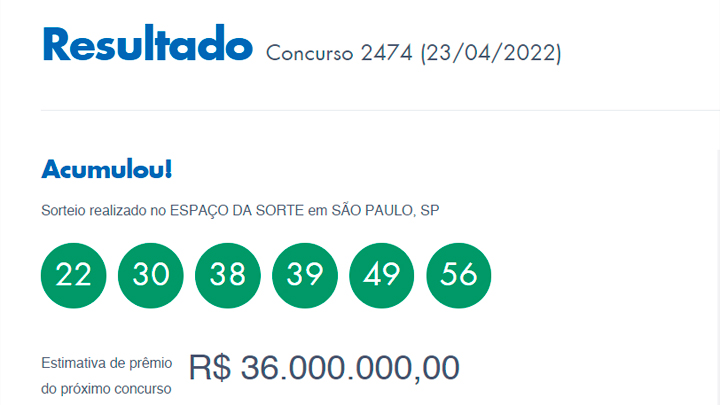 Por motivo de segurança os dados do apostador vencedor não são divulgados. A posta foi realizada com a marcação de 8 números, dos quais 5 foram acertados. O acerto das 6 dezenas faria um novo milionário em Tijucas com o valor de 30 milhões no banco.