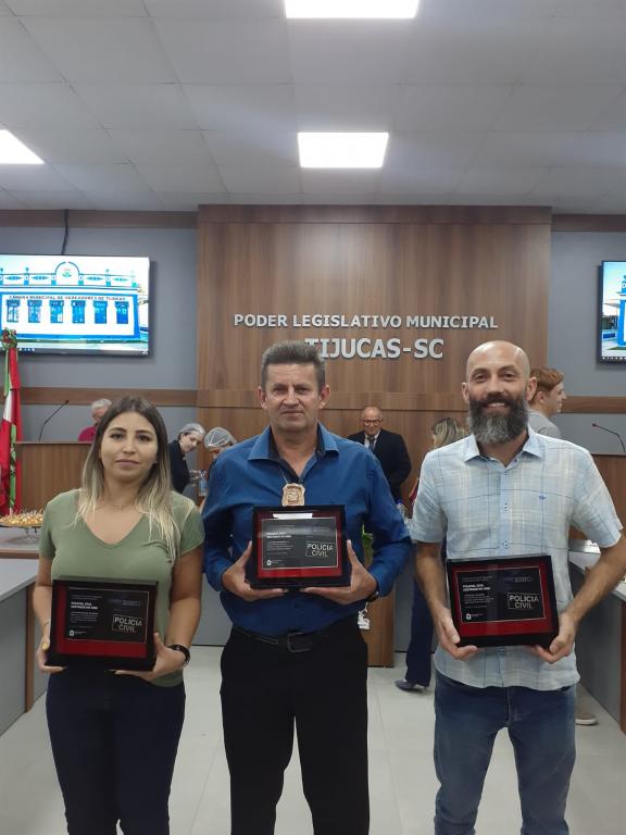 Agentes de Polícia da Delegacia da Polícia Civil da Comarca de Tijucas foram homenageados pela Câmara de Vereadores de Tijucas. Eles receberam o prêmio de destaque do ano pelos trabalhos realizados pela Polícia Civil na comunidade.