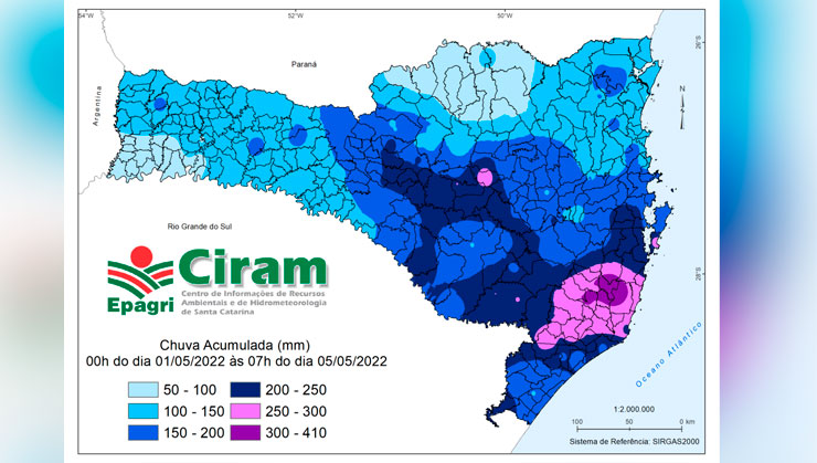 O volume de chuva dos primeiros dias de maio superou a média climatológica do mês na maioria dos municípios de Santa Catarina, especialmente nas regiões do centro ao sul do Estado, onde foram registrados valores acima de 250mm nesse período. No mapa da Figura 1 e na Tabela 1 observa-se a chuva registrada entre 0h do dia 01 e 7h do dia 05/05, que ocorreu de forma persistente, resultando em alagamentos, com elevação do nível dos rios (ver Aviso Hidrológico), e deslizamentos de encosta. O maior registro, de 409,40mm, ocorreu em São Martinho, no Litoral Sul, que representa quatro vezes a chuva esperada no mês inteiro de maio. Em Florianópolis, Mirim Doce (Vale do Itajaí) e Braço do Norte (Litoral Sul), os totais ficaram entre 270 e 300mm.