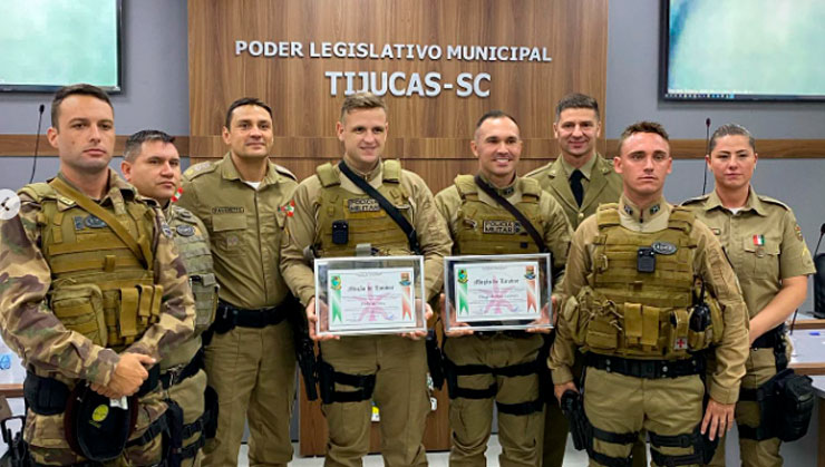 Os soldados André da Silva e Thiago da Rosa Calonico foram homenageados na sessão da câmara de vereadores desta quinta-feira (05), em Tijucas. Eles receberam uma moção de aplausos das mãos do presidente da casa Maickon Sgrot (PP).