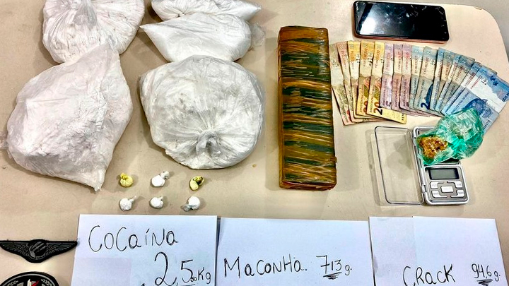 Na sequência foi solicitado apoio da Agência de Inteligência do 31⁰ BPM, que se deslocaram até a residência do autor. Em uma busca minuciosa no local, foi encontrado embaixo do sofá 2,550kg de cocaína, 94,6g de crack, 713g de maconha e uma balança de precisão pequena.