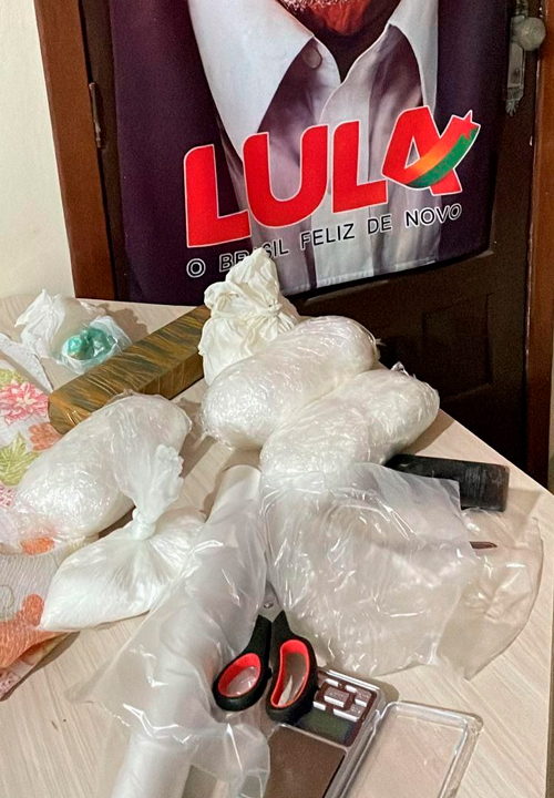 Na imagem dos entorpecentes em cima da mesa, na casa do traficante é possível ver a propaganda do ex-presidiário em uma porta com nome do candidato Lula e a frase “O Brasil Feliz de Novo”.