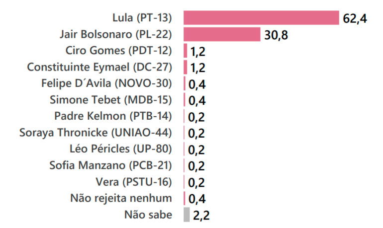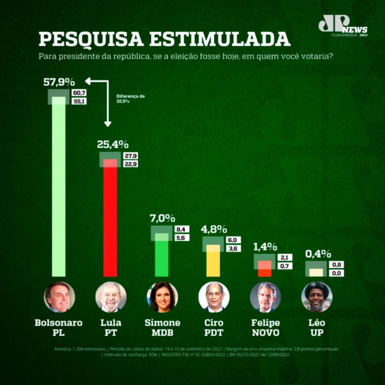 A segunda pesquisa Jovem Pan News/Mapa, divulgada neste domingo (18), mostra um cenário consolidado e a favor do presidente Jair Bolsonaro (PL), candidato a reeleição. Ele tem mais que o dobro da intenção de votos do segundo colocado, a pesquisa foi registrada na Justiça Eleitoral com os protocolos SC-03803/2022 e BR-05255/2022.