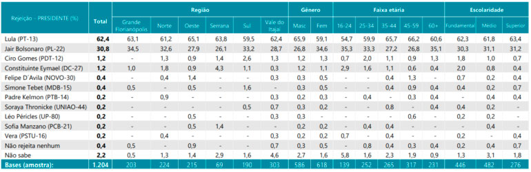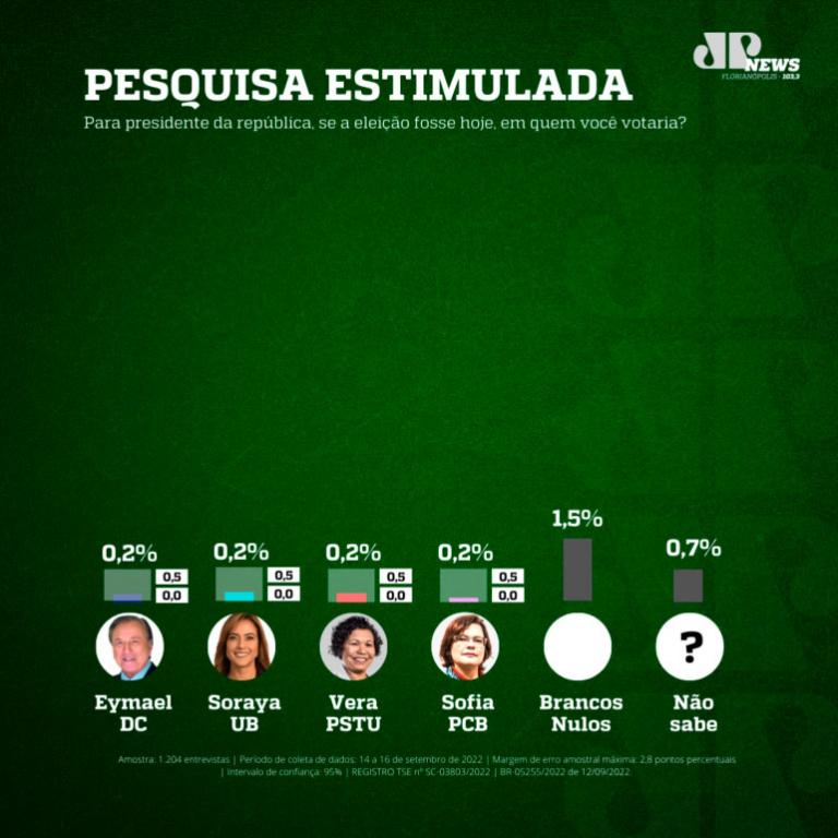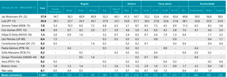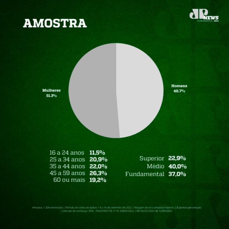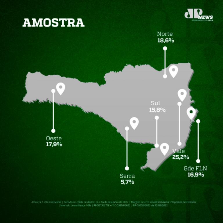 Segundo o Mapa, a pesquisa foi feita por meio de aplicação de questionário estruturado en ligações automatizadas para telefones fixos e celulares. Universo: eleitores de Santa Catarina com 16 anos ou mais. A amostra é estratificada por região geográfica, distribuídas em 77 municípios do estado. Foram 1.204 entrevistas entre os dias 14 a 16/9.
