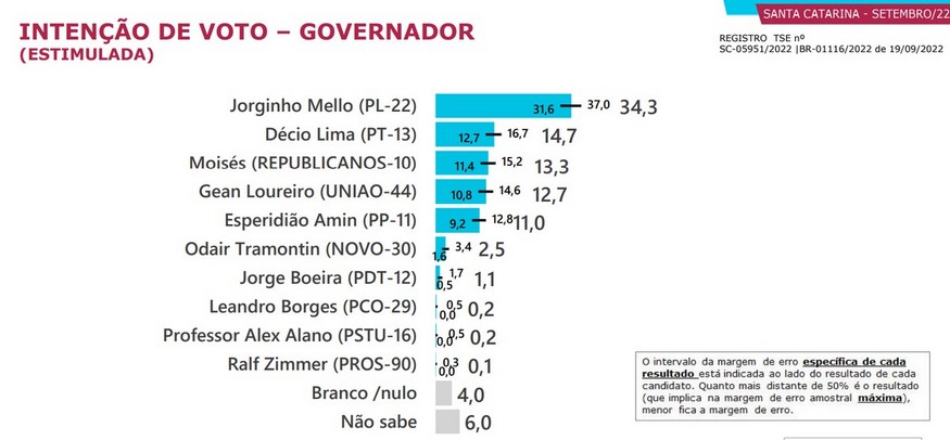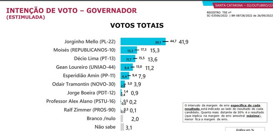 A situação ao governo do Estado foi similar. Pela margem de erro, Jorginho Mello (PL) tinha 39,1% e terminou a apuração com 38,6%. Também houve acerto do Mapa que apontou a ida de Décio Lima (PT) ao segundo turno, conquistando uma intenção de votos superior a de Moisés (REP) na terceira pesquisa.