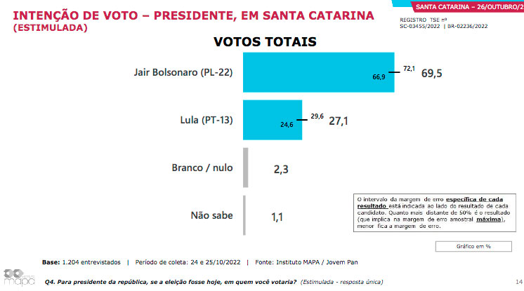 O instituto MAPA publicou nesta quarta (26.10) uma pesquisa que mostra uma diferença de 44% pontos a mais para o Presidente Bolsonaro contra Lula no 2º Turno em Santa Catariana.