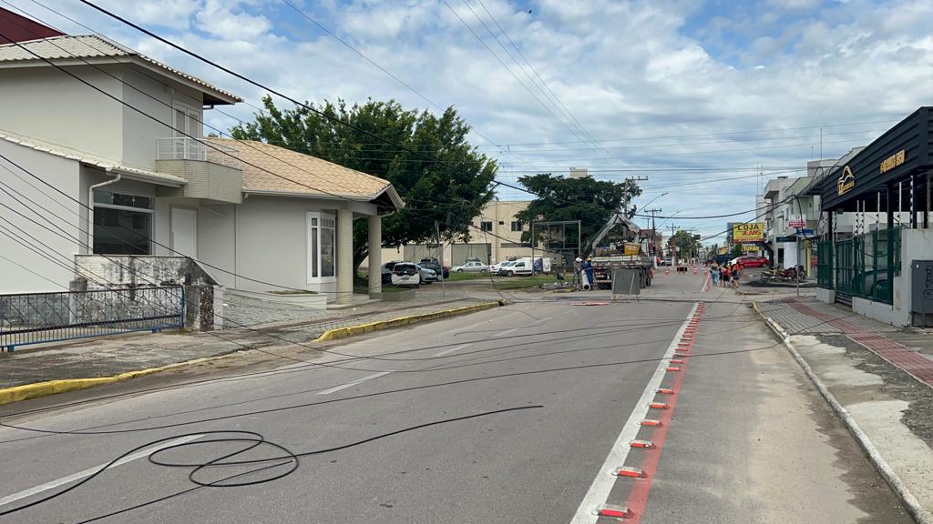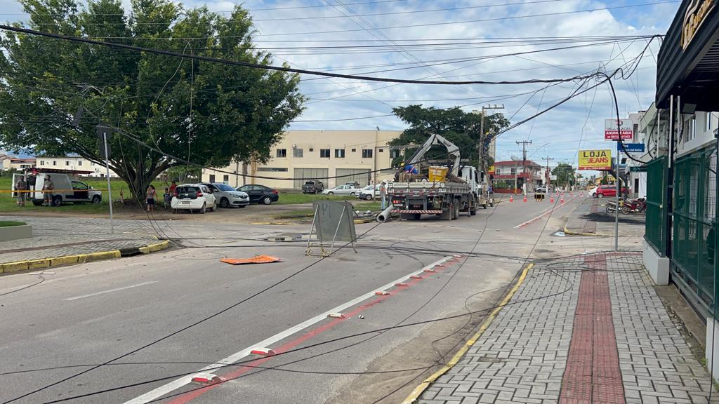O condutor de um caminhão deixou parte do centro de Tijucas sem energia e internet na manhã desta terça-feira (13/12), um poste da rede elétrica foi arrancado e arrastado por alguns quilômetros pelas ruas da cidade.