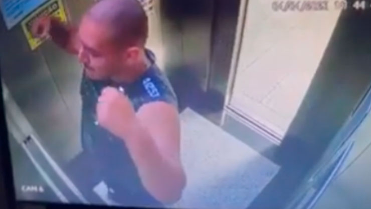 O criminoso aparece sorrindo nas imagens, encena alguns golpes enquanto se olha no espelho e arruma no pescoço o parece ser um fone de ouvido, logo a porta do elevador abre ele vai embora.