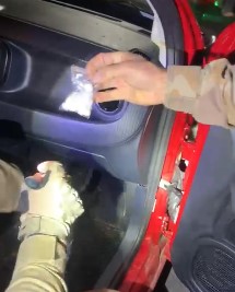 Ao realizar uma busca no veículo, os policiais encontraram uma substância semelhante a maconha dentro de uma carteira de cigarro. Além disso, foi localizada uma sacola transparente com pacotes brancos dentro de um dos dutos de saída de ar do veículo. Ao abrir a sacola, foram encontradas oito petecas de uma substância semelhante à cocaína.