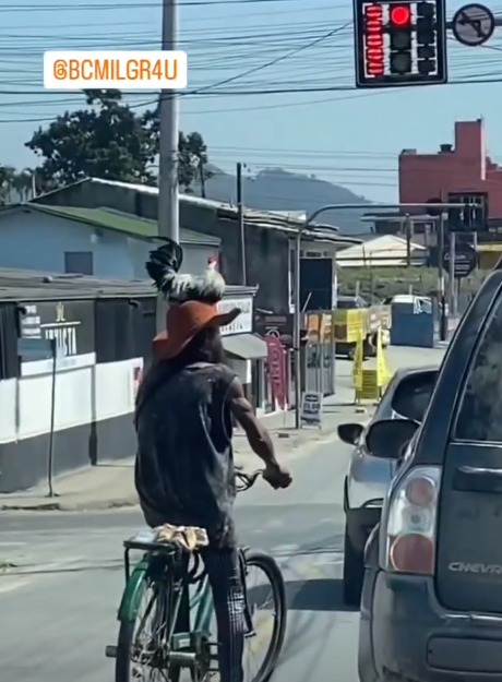Uma cena pra lá de inusitada chamou a atenção dos moradores de Balneário Camboriú nesta sexta-feira (18/08). Um homem foi flagrado andando de bicicleta com um galo empoleirado em sua cabeça, enquanto ambos esperavam no semáforo das ruas da cidade.