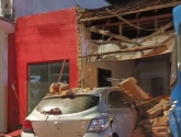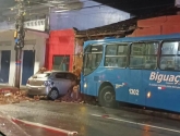 Um carro na contramão colidiu em uma residência após cortar a frente de um ônibus na rua Santos Saraiva no bairro Estreito, em Florianópolis.