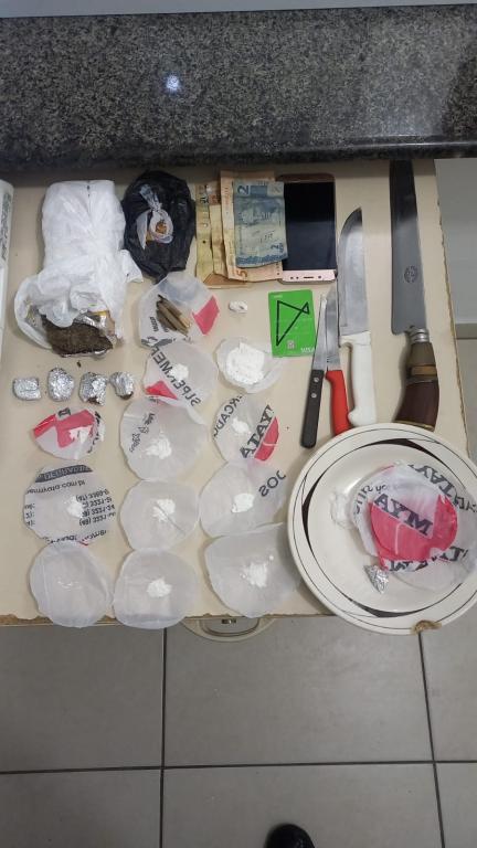 No momento da abordagem, M. confessou ter um mandado de prisão em seu desfavor pelo crime de tráfico de drogas, emitido pela Comarca de Porto Belo. Além disso, ele revelou que havia drogas em sua residência. Ao retornarem à casa, as autoridades encontraram uma grande quantidade de drogas, incluindo maconha, cocaína e crack, além de utensílios utilizados no preparo e embalagem das substâncias ilícitas.