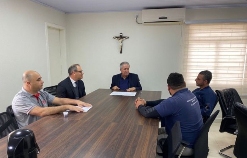 O superintendente da Fundação Municipal de Esportes (FME), Ezequiel de Amorim, os vereadores Claudemir Correia e Maickon Campos Sgrott, e o representante da empresa Navarini, vencedora do processo licitatório para a execução da obra, também estiveram presentes.