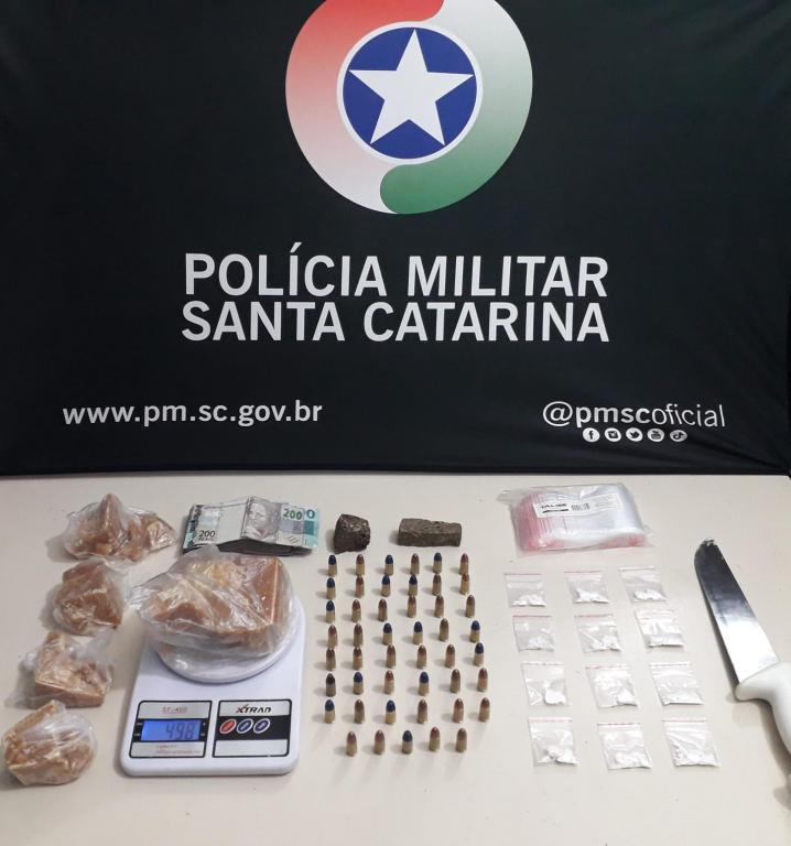 Na sequência da ação policial, a residência foi submetida a busca e apreensão, resultando na apreensão de uma significativa quantidade de drogas e outros itens relacionados ao tráfico. Os materiais apreendidos incluíram 900g de crack, 50g de maconha, 12 buchas de cocaína, 46 munições de calibre 9mm, uma balança de precisão, 494,00 reais em dinheiro, uma faca e 1.000 embalagens tipo ziplock.