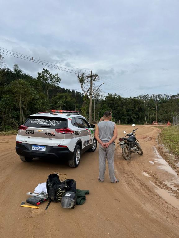 Uma ação policial resultou na perseguição e prisão de um indivíduo em São João Batista após a abordagem de uma motocicleta com a placa levantada. O condutor da motocicleta tentou fugir da polícia, mas acabou sendo capturado.