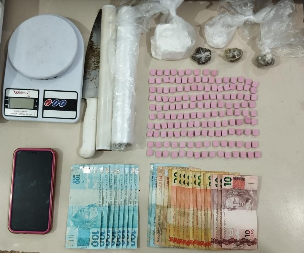 Ao adentrar o local, o casal suspeito foi abordado e os policiais encontraram uma quantidade significativa de drogas, incluindo 148 comprimidos de ecstasy, 117 gramas de cocaína, 13g de haxixe, 10g de maconha, além de R$800,00 em notas falsas, R$610,00 em dinheiro, apetrechos relacionados ao tráfico, uma balança de precisão, uma faca com resquícios de drogas e um rolo de embalagens, bem como um iPhone 11 Pro Max.