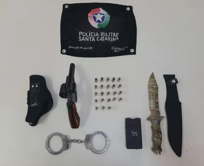 A PM informou que ele estava portando um revólver calibre .38 contendo seis munições, uma faca e uma máquina de choque. Além disso, o homem tinha em sua posse algemas e mais 17 munições calibre .38.