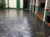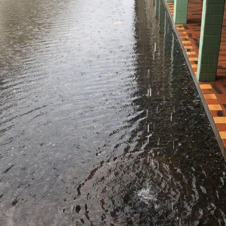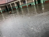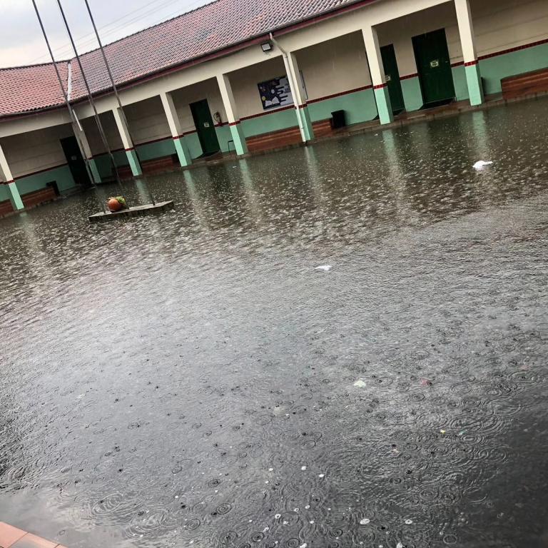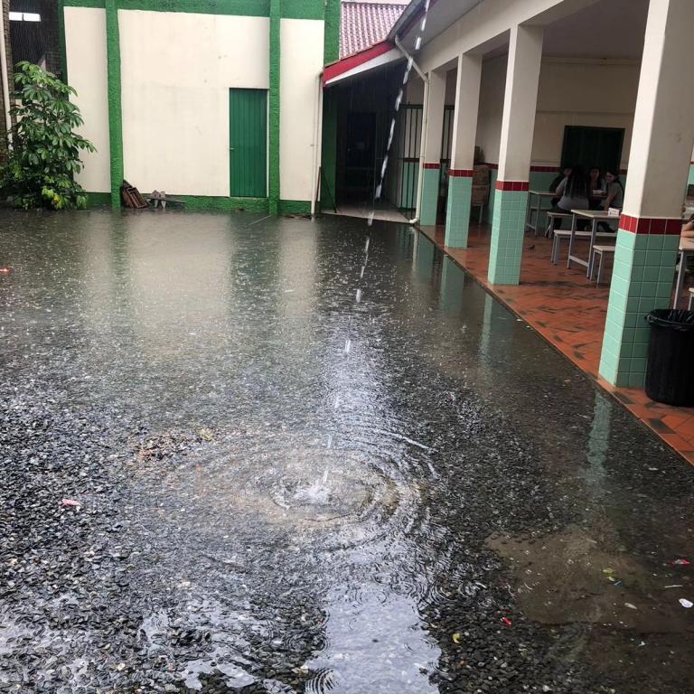 As imagens revelam a presença de áreas alagadas no pátio da escola, no entanto, a administração da E.E.B Professora Minervina Laus tomou a decisão de manter as atividades letivas.