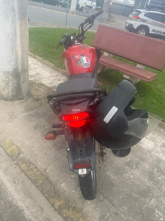 Em seguida, foi consultado o chassi da motocicleta, que estava sem placa de identificação. Foi constatado que a moto YAMAHA/YBR150 FACTOR tinha registro de furto em São Bento do Sul no dia 13/01/23.