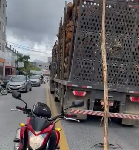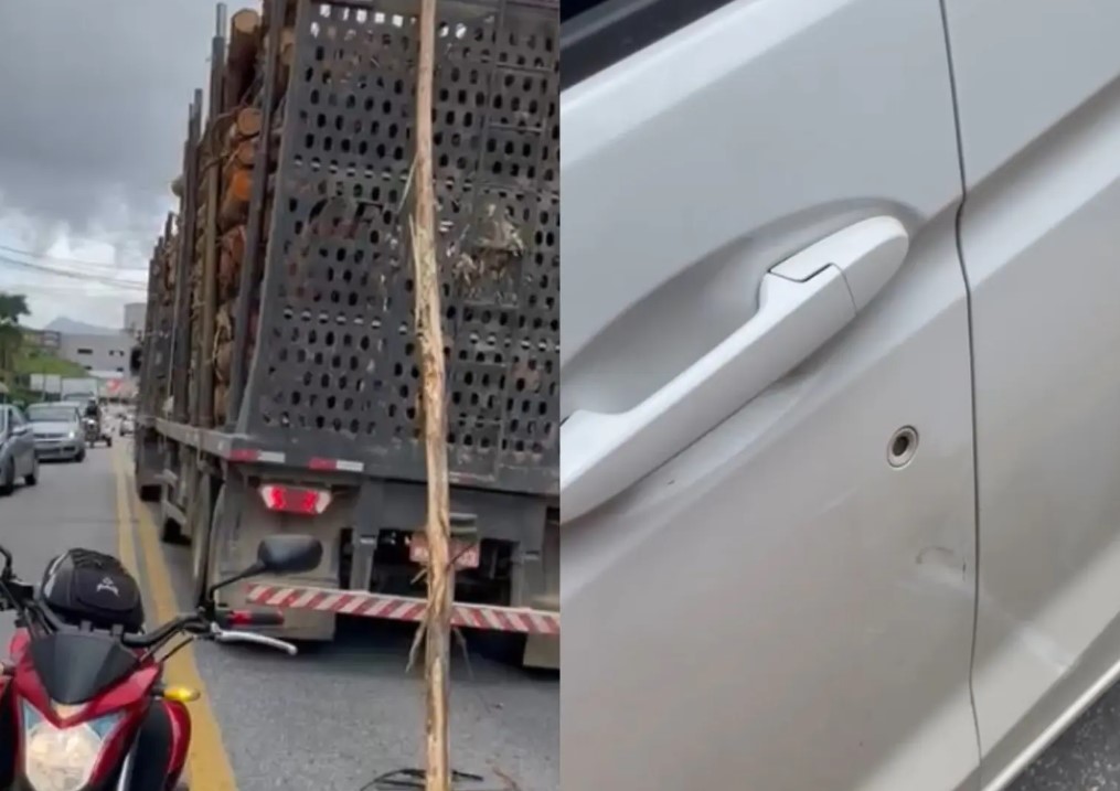 A condutora relatou que seguia para o trabalho no sentido centro ao bairro, e, ao parar devido ao trânsito congestionado, uma tora de eucalipto caiu do caminhão que vinha no sentido contrário, atingindo a lateral do seu veículo. Por sorte, a tora não atingiu a frente do carro nem um motociclista que estava atrás, evitando danos maiores.