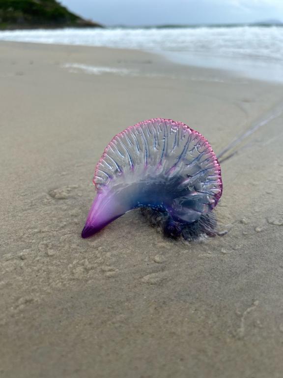 Internautas registraram a presença de Caravela-Portuguesa nas águas dad praias de Zimbros e 4 Ilhas. A Caravela-Portuguesa, uma espécie de água-viva, é conhecida por sua aparência colorida e tentáculos longos.