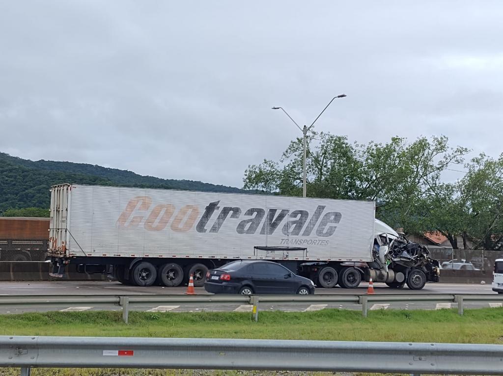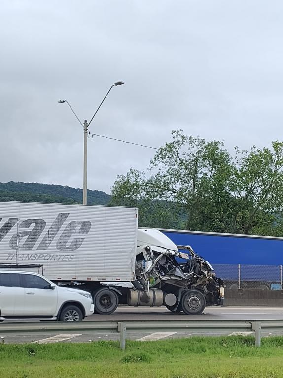 Um acidente ocorreu nesta terça-feira (05/03), em frente ao Posto do Avião, na BR-101, entre Tijucas e Porto Belo. Imagens impressionantes mostram a frente de um caminhão completamente destruída. Até o momento, não há informações sobre feridos ou detalhes da dinâmica do acidente.