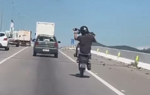 Nas imagens, o motociclista é visto realizando a manobra perigosa enquanto trafega pela ponte, desafiando a segurança própria e dos outros usuários da rodovia.