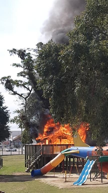 Na tarde desta sexta-feira, 9, os bombeiros foram acionados para combater um incêndio em uma estrutura de madeira conhecida como Casa da Árvore, onde as crianças costumam brincar, localizada no Casarão Gallotti, na Rua Coronel Gallotti, no centro de Tijucas.