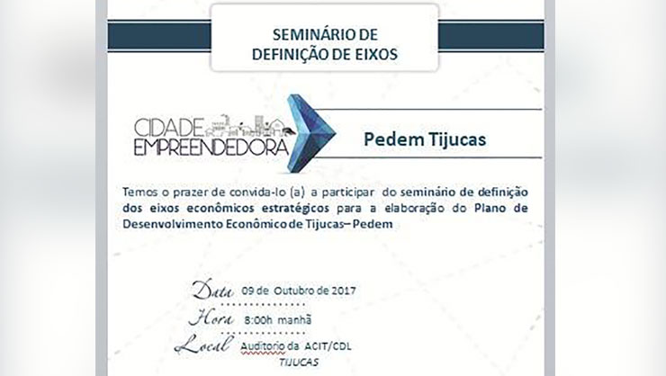 Tijucas vai sediar na próxima segunda-feira (09), um seminário para definição de eixos estratégicos que vão auxiliar na elaboração do PEDEM (Plano de Desenvolvimento Econômico do Município). A ação faz parte do cidade empreendedora, programa que o município mantém em parceria com o Sebrae/SC.