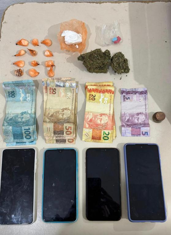 Com base nos levantamentos foi realizada a abordagem e durante as buscas, foram localizados diversos entorpecentes e materiais relacionados à prática criminosa, entre eles: