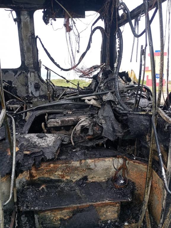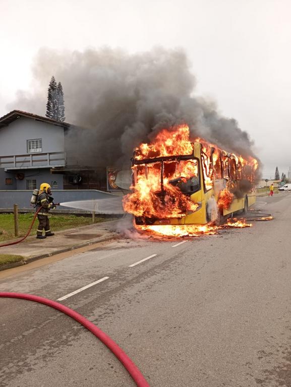 Quando a guarnição do Corpo de Bombeiros chegou ao local, o ônibus já estava totalmente tomado pelas chamas, posicionado sobre a pista de rolamento e próximo a uma residência de madeira, o que gerava risco de propagação do fogo.