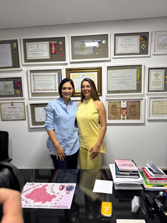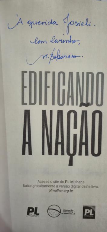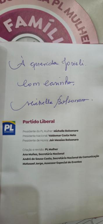 Na sequência, Josiéli se encontrou com a ex-primeira-dama Michelle Bolsonaro, presidente nacional do PL Mulher. Durante a reunião, recebeu uma dedicatória especial no manual de diretrizes do movimento, reforçando o apoio ao seu trabalho no município catarinense.