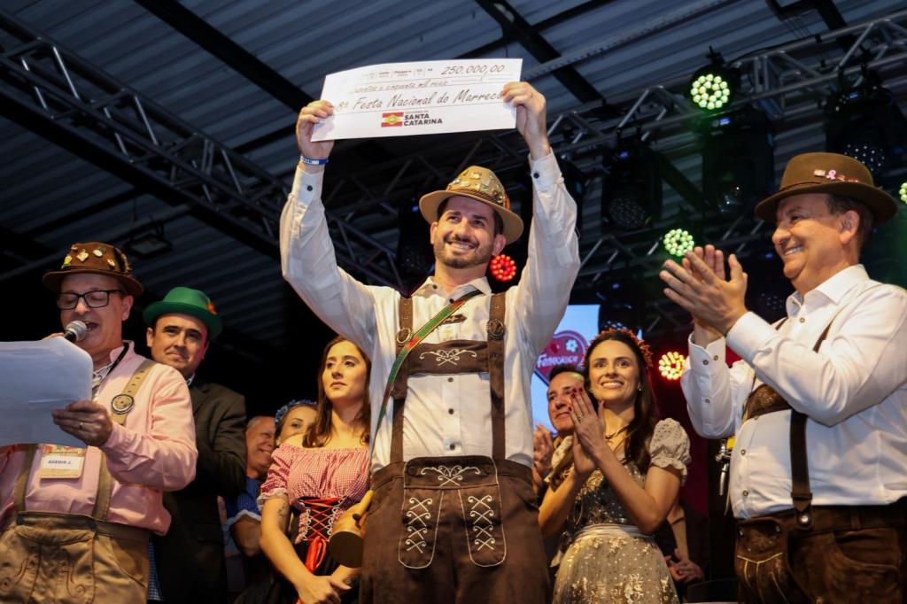 O governador Jorginho Mello participou da abertura da 38ª edição da Festa Nacional do Marreco, a Fenarreco, nesta quinta-feira , 9, em Brusque. Antes da sangria do primeiro barril de chopp do evento de cultura alemã, houve a entrega do cheque símbólico do investimento de R$ 250 mil reais por parte do Governo do Estado.