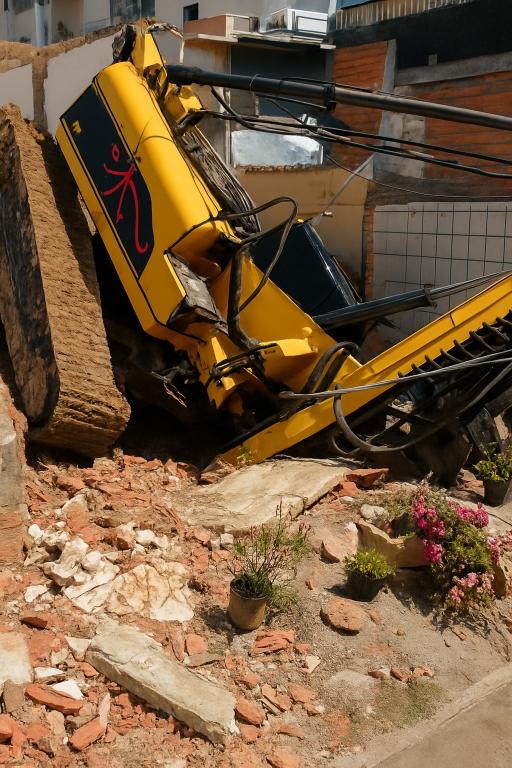 No momento do deslizamento, o equipamento atingiu duas residências vizinhas e um veículo estacionado. As equipes de resgate foram acionadas para conter o vazamento de óleo e combustível e verificar se havia outros riscos na área.